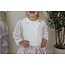 Prachtige witte chiffonblouse afgewerkt met kraagje, vaste strik en parelknoopjes.