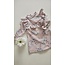 Afgewerkt met opstaand kraagje en ruches op de schouders en borst.