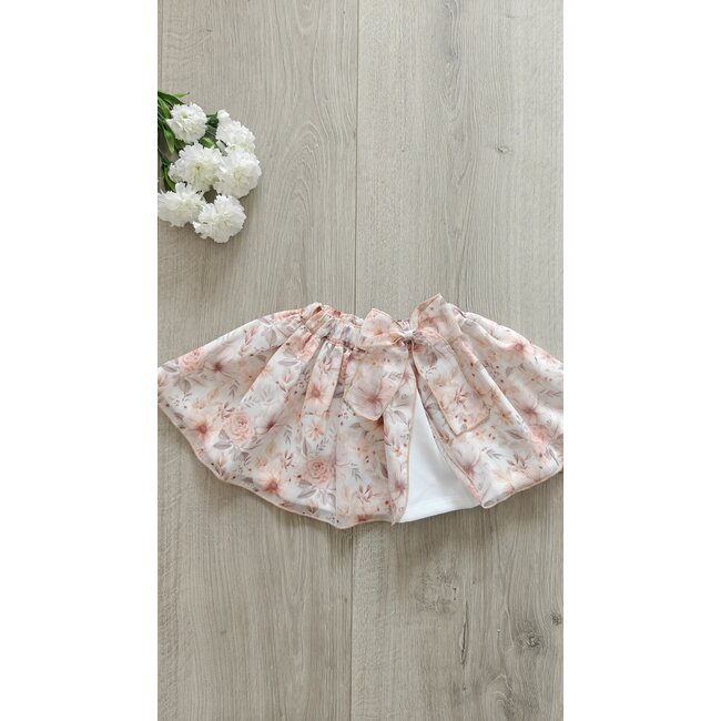 Prachtig chiffon rokje in nude bloemenprint van Cordel, afgewerkt met openlopende ruches en een strik.