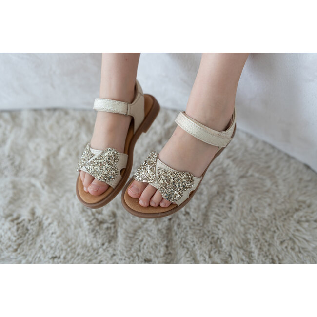 Prachtig gouden sandaaltje met glitter hartjes van Beberlis.