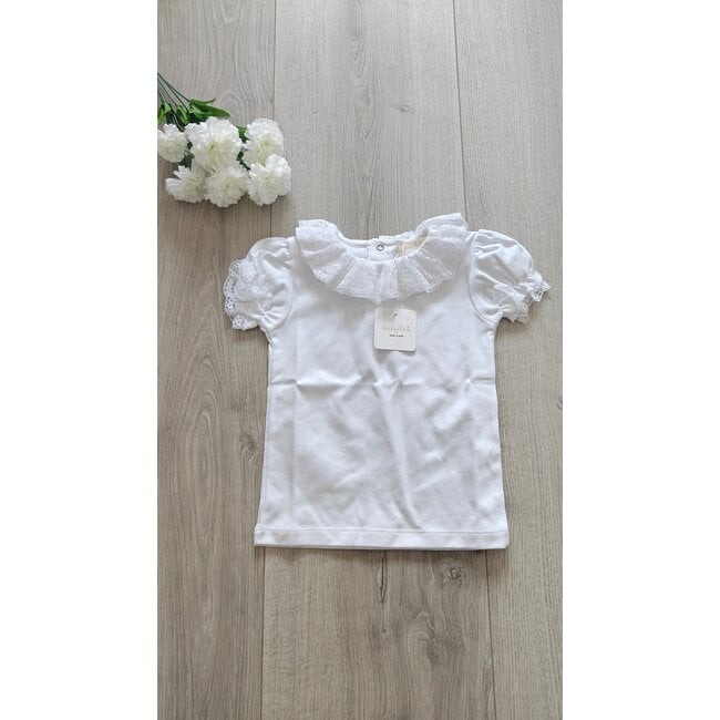 Prachtige witte t-shirt met lange mouwtjes afgewerkt met een kanten kraagje en kanten detail aan de mouw.