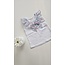 Het T-shirt heeft geen mouwtjes, is afgewerkt met een blauwe chiffon bloemenprint stof als kraagje, achteraan in dezelfde stof een strik op de rug.