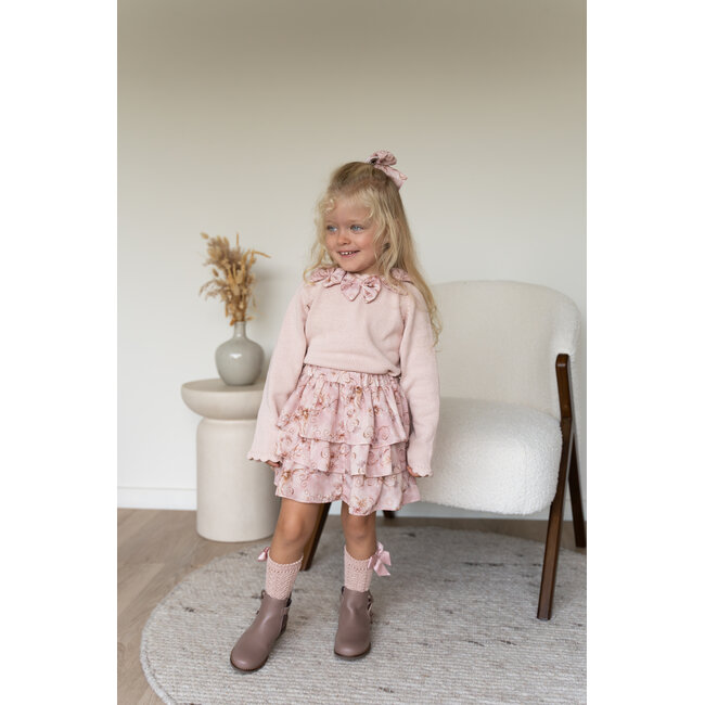 Prachtig roze truitje met drie strikjes in onze exclusieve bloemenprint langs de zijkant en knoopjes.